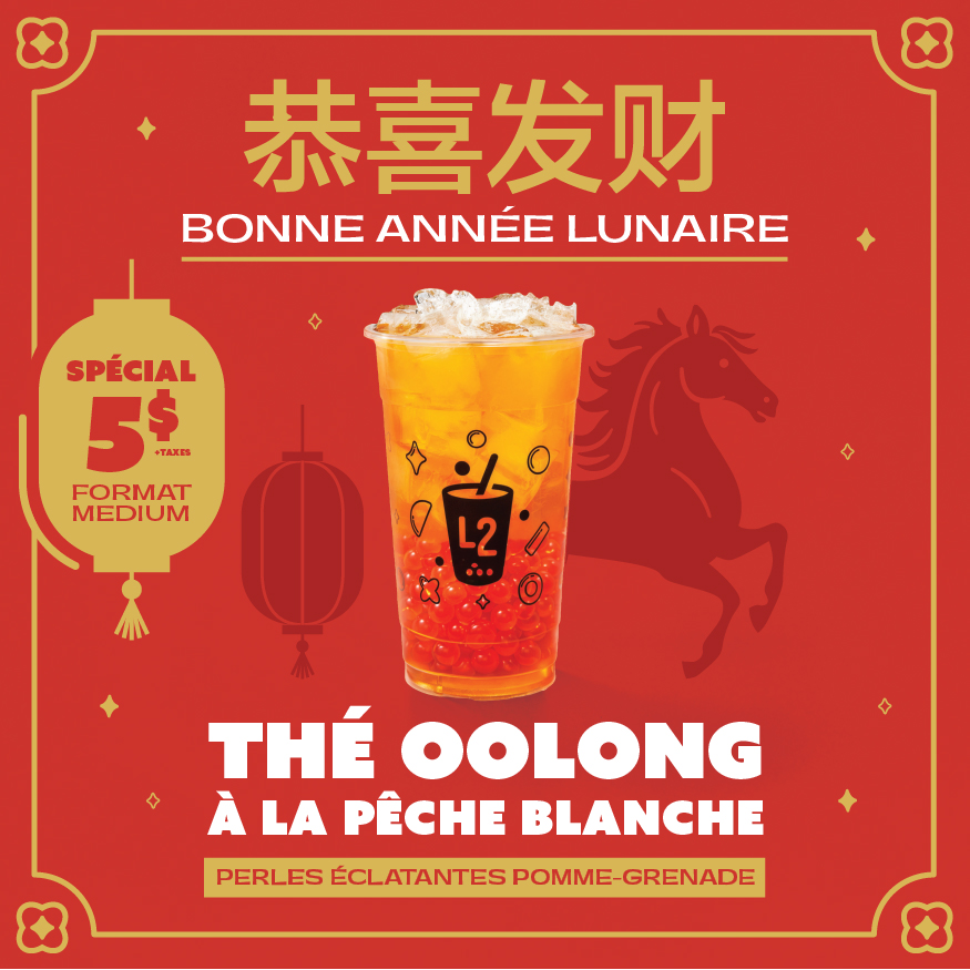 Sirotez la chance avec un thé oolong à la pêche blanche garni de perles éclatantes de pomme-grenade pour 5$.