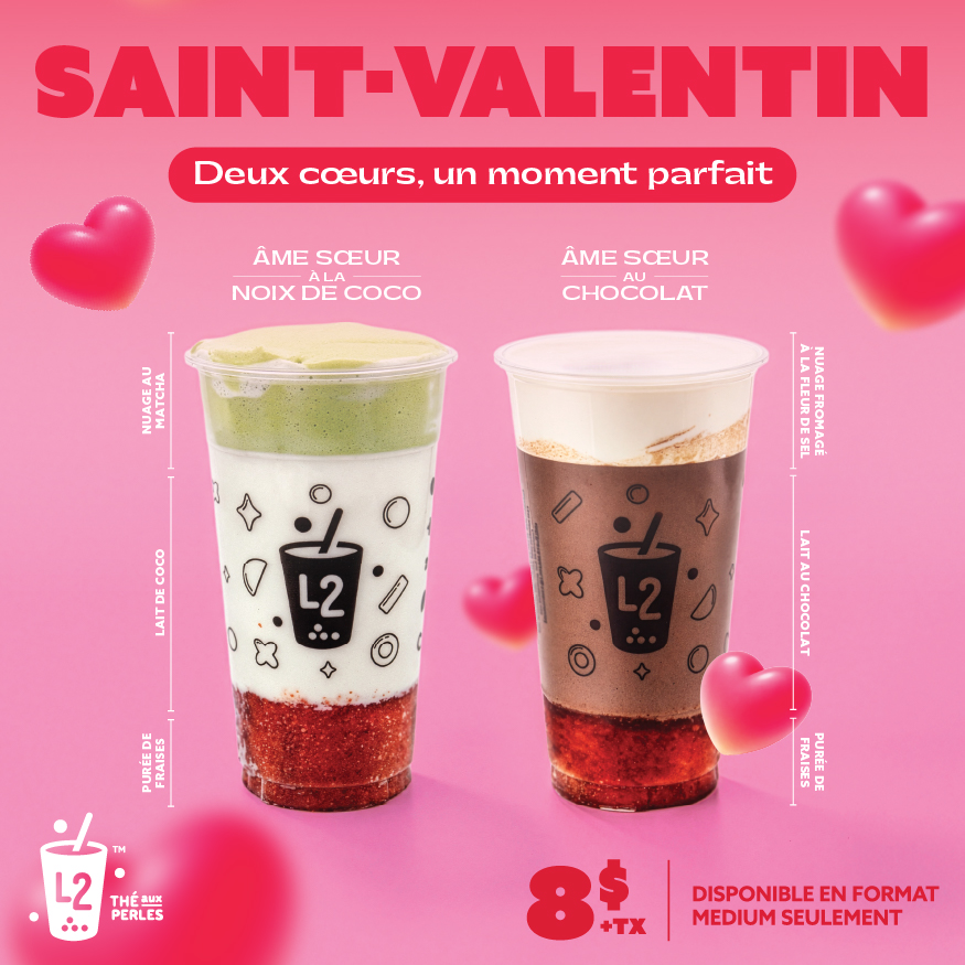 Pour une durée limitée, découvrez nos deux boissons spéciales Saint-Valentin : Âme Sœur Chocolat ou Âme Sœur Noix de Coco, à 8 $. Savourez l’instant avec un boba parfait.